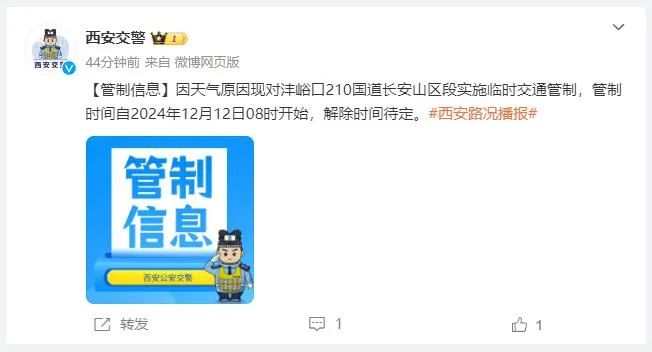 因天氣原因現*對灃峪口210國道長安山區段實施臨時交通管制,管制時間自2024年12月12日08時開始,*解除時間待定。