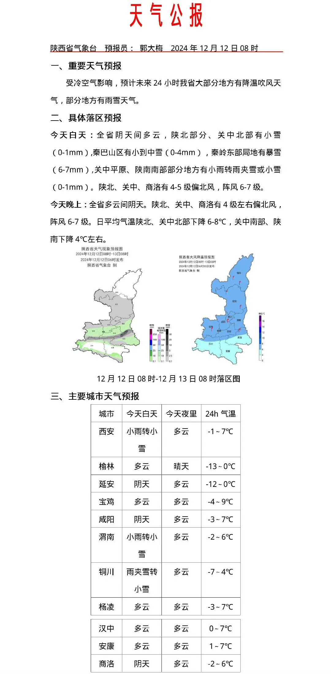 值得關注的是,*12到13日陝西大部地方將迎來一次降温吹風天氣,*降温幅度在6℃左右,可能局地達到8℃以上。最低氣温在陝北以及關中北部,秦嶺山區最低氣温可以達-10到-15℃。