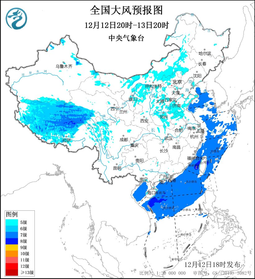 預計,12月12日20時至13日20時,內蒙古、陝西北部、山西、河北北部、河南、山東等地部分地區有5級風,陣風6~8級;黃海大部海域、東海大部海域、台灣海峽、台灣以東洋麪、巴士海峽、南海北部和中部海域,北部灣將有7~8級,陣風9級的大風。