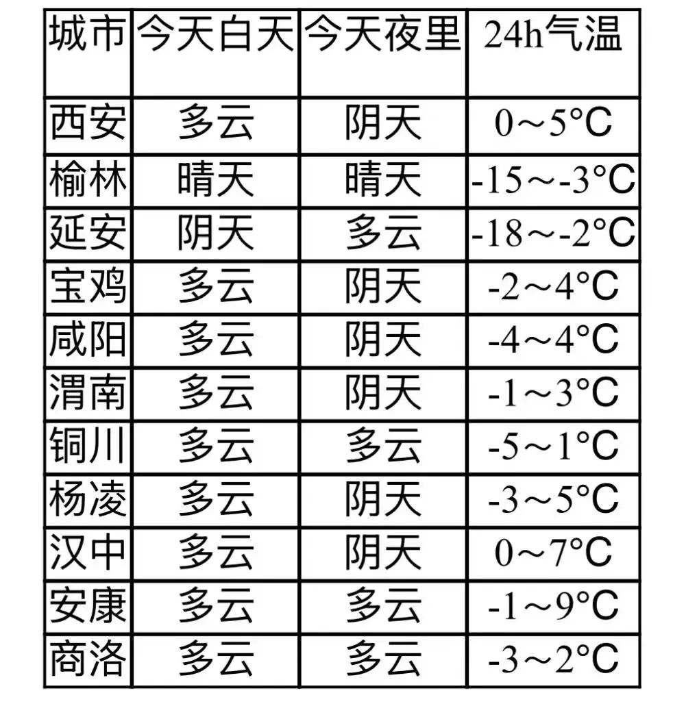 *預計今天白天:*陝北多雲轉晴天,關中、陝南多雲,陝北東部、關中東部有4級左右偏北風。日平均氣温陝北、關中中東部、陝南東部下降4℃左右。