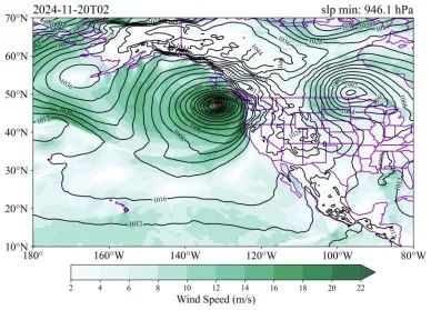 11月20日2時,北美炸彈氣旋達到最強時刻。實線為平均海平面氣壓,紅點為炸彈氣旋中心位置,填色為地表風速(米/秒)。繪圖:肖雪