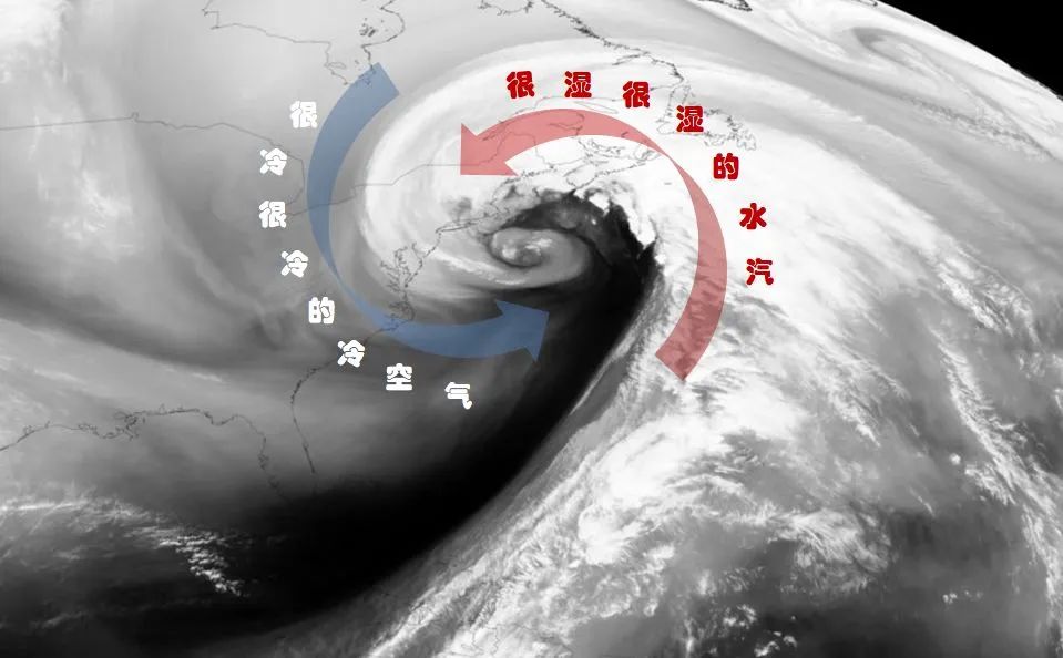 炸彈氣旋是一種快速增強的低氣壓系統,作為冬季極端天氣的代表,其形成過程與颶風截然不同,這主要表現在兩類渦旋系統對斜壓性的依賴方面,炸彈氣旋是典型的斜壓系統,而颶風的斜壓性則弱得多(變性為温帶氣旋之前)。在北美地區,炸彈氣旋通常是由冷空氣與大西洋上的暖濕空氣相遇而形成的。其實,從數據上形容炸彈氣旋或許更為直截了當,即當風暴的中心氣壓在24小時內相對於北緯60度緯線急劇下降超過24百帕時,就被稱為炸彈氣旋。
