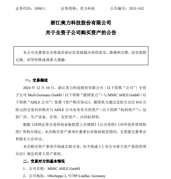 【環球網財經綜合報道】12月12日晚,美力科技發佈公告稱,12月10日,全資子公司Meili Germany GmbH(下稱“德國美力”)與MSSC AHLE GmbH(下稱“AHLE公司”)簽署《資產購買協議》。