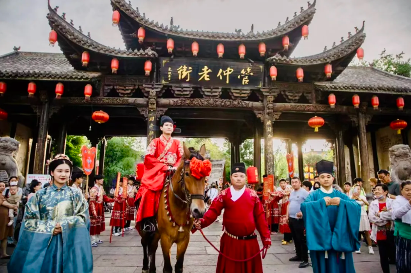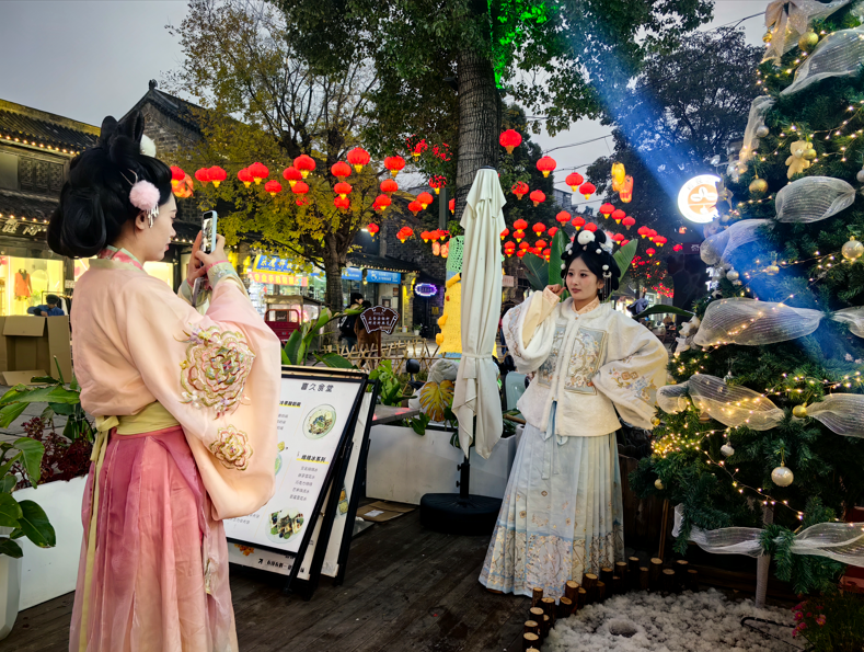 遊在老街,樂在老街。節假日的老街,河道花船、國家級非遺花鼓燈、大鼓書、琴書、快板、推劇、古典婚禮秀等輪番上演,整條街都變成了民俗表演的舞台,讓遊客沉浸式近距離欣賞,深厚的文化變得可親可感。今年10月,老街“古典婚禮秀”項目入選“十大長三角古鎮文旅消費新場景”。更可喜的是,受“古典婚禮秀”啓發,已有近10對新人選擇在老街舉辦古典婚禮,讓傳統文化迴歸人們的日常。