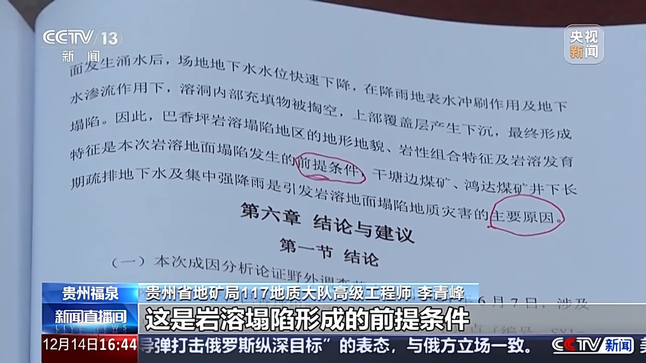 *貴州省地礦局117地質大隊高級工程師 李青峯:*巴香坪這個地區,從地質條件來説,它下面本身就存在着很多岩溶溶洞,這是岩溶塌陷形成的前提條件。第二,就是周邊的兩家煤礦長期開採疏排地下水和地表強降雨的共同作用下,誘發了地面塌陷形成。