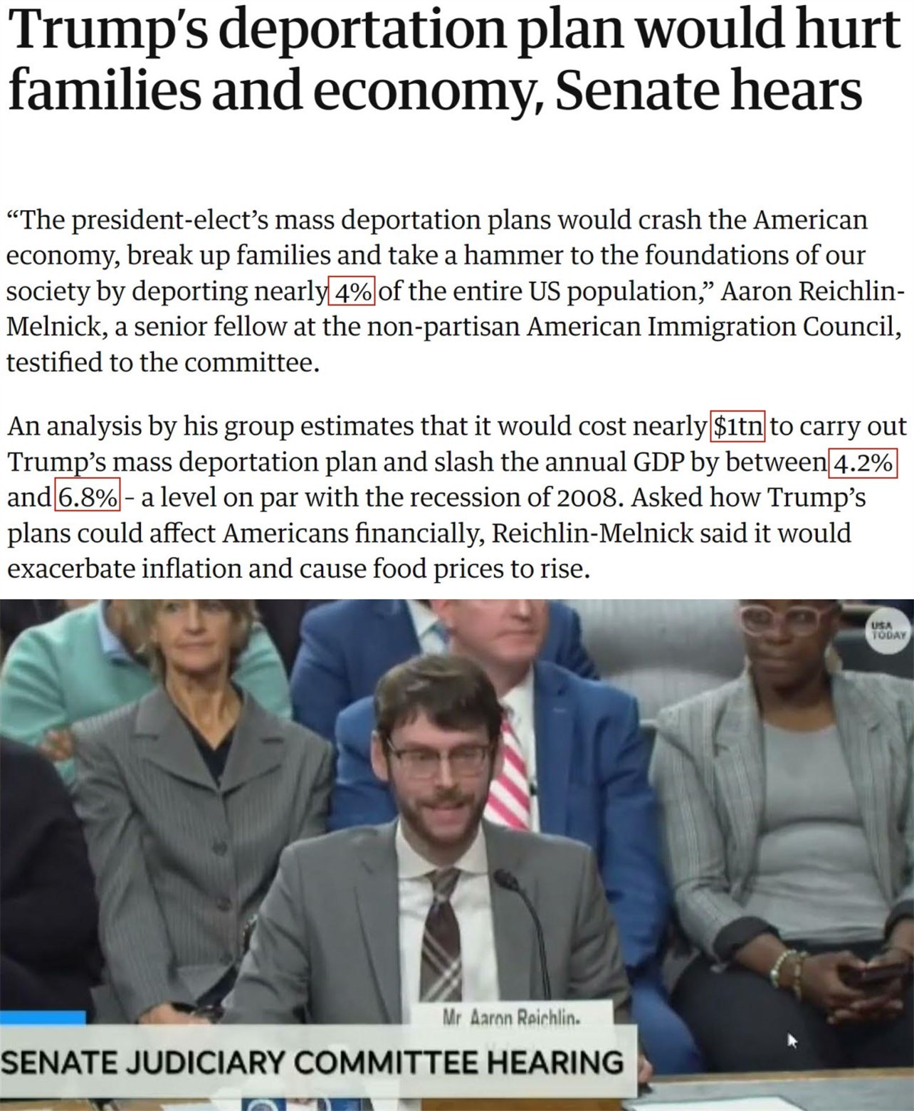 在本月10日美國參議院司法委員會召開的關於特朗普大規模驅逐計劃的聽證會上,美國移民委員會高級研究員亞倫·賴克林-梅爾尼克表示,特朗普的計劃將驅逐近4%的美國人口,從而導致美國經濟崩潰、家庭破碎、社會基礎遭到重擊。
