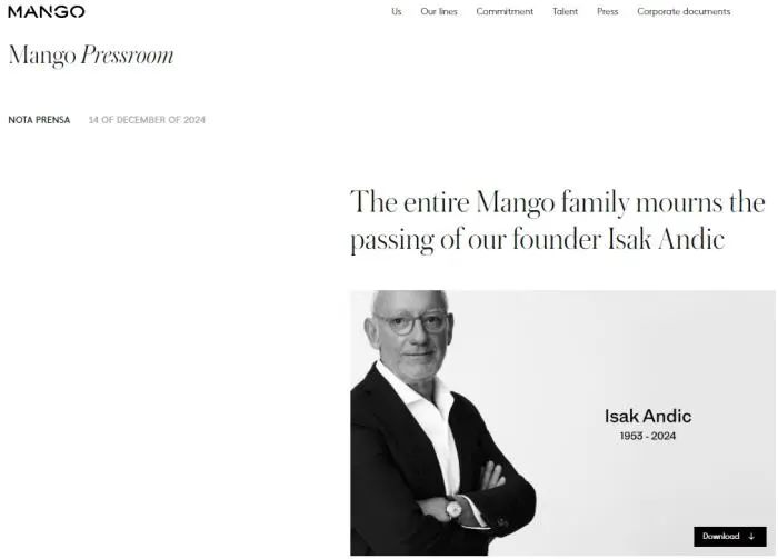 綜合報道,西班牙時尚品牌Mango公司在一份聲明中宣佈,該公司創始人伊薩克·安迪克(Isak Andic)於當地時間12月14日意外去世。