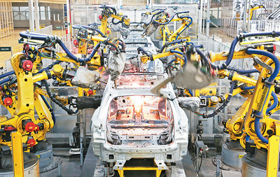 十二月十日,在理想汽車常州基地焊裝車間,機械臂在對車身進行自動化焊接。陳 暐攝(人民圖片)