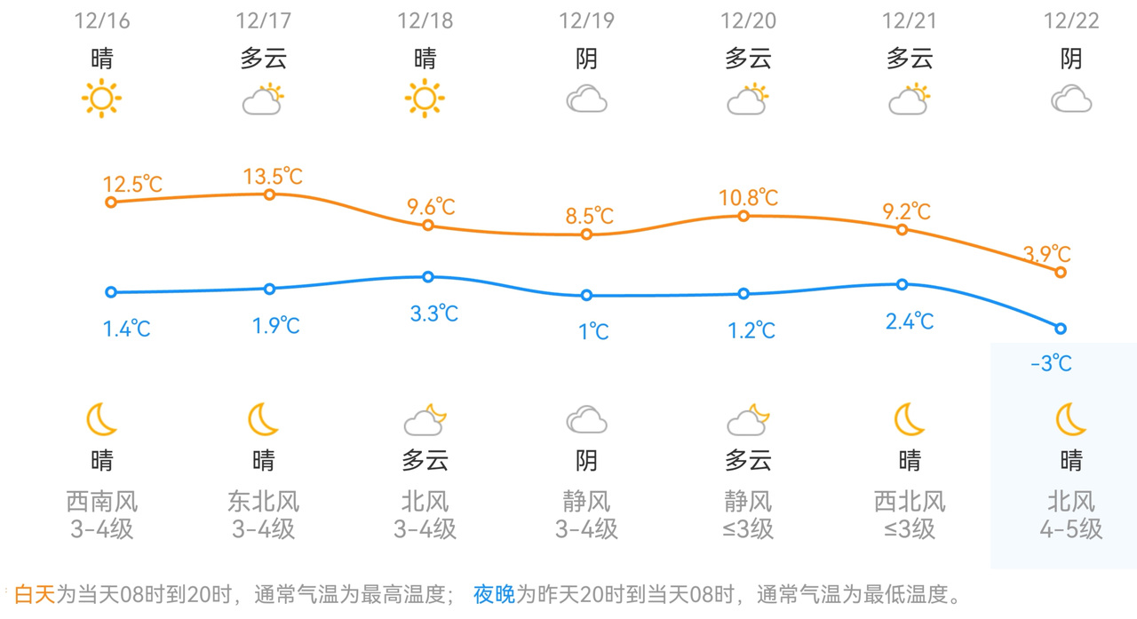第二波冷空氣會帶來氣温下降,最低氣温可能比今、明兩天還要更低——本週日最低-3℃,最高也僅4℃左右,日平均氣温不足1℃,寒冷貫穿全天!