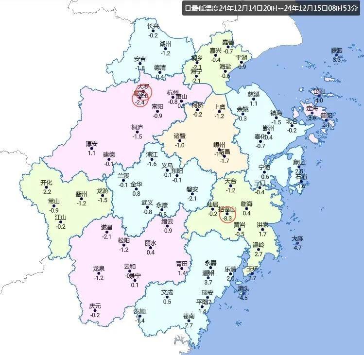 在冷空氣和晴天輻射降温的雙重夾擊下,昨天(12月15日)早晨,浙江冰寒徹骨,除東南沿海及海島外,大部最低氣温-2℃到0℃。山區就更冷了,-6℃到-3℃,比一些北方城市的氣温還要更低。
