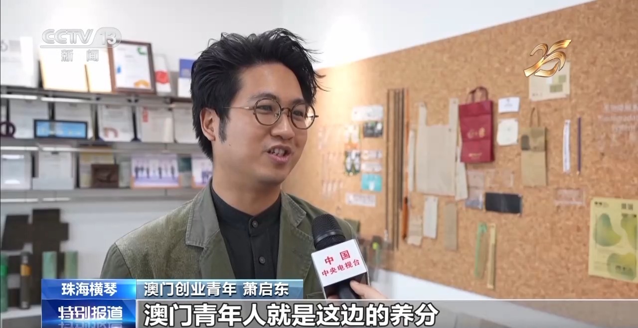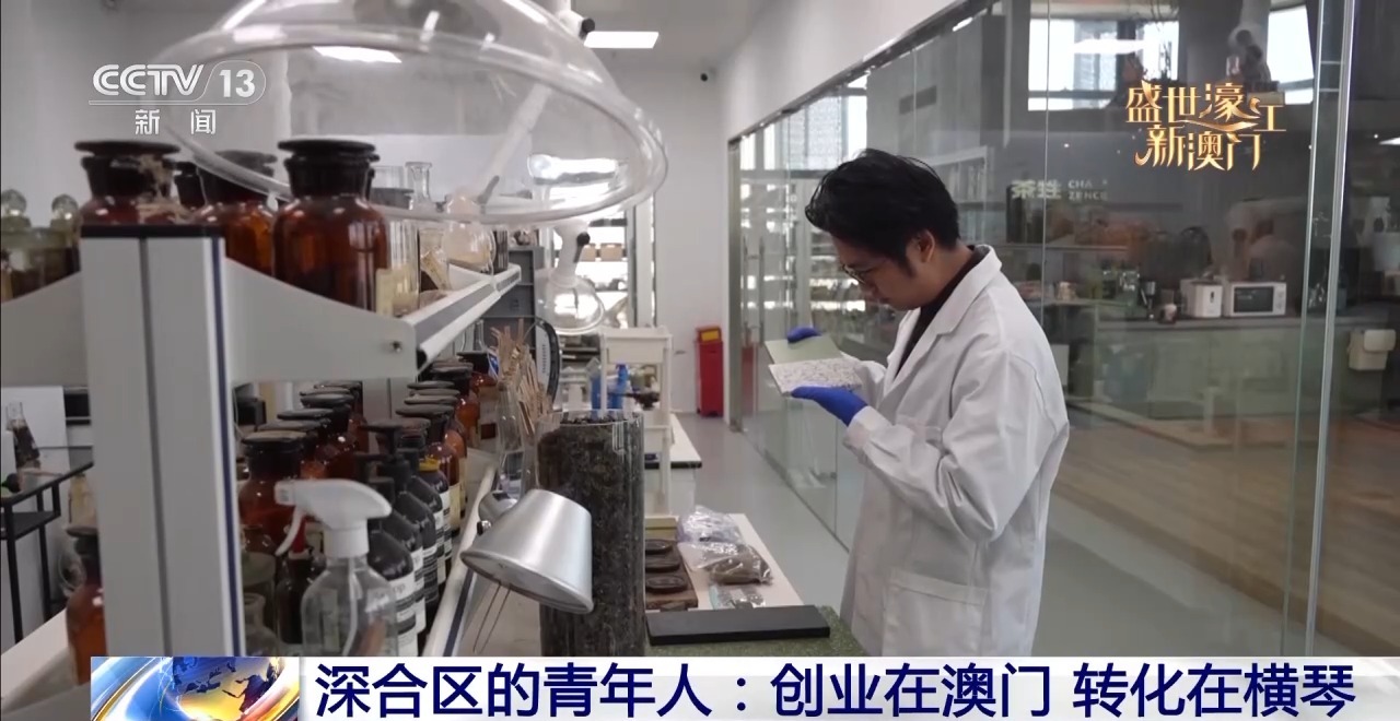打造新家園,開拓新空間。在離橫琴口岸不遠的一棟寫字樓,澳門青年蕭啓東正在實驗室仔細對比一塊最新研發的環保材料。蕭啓東2020年在澳門創業,開了一家科技公司,主要研發把茶渣、中草藥渣等廢棄物製作成可再利用的環保材料。2023年,蕭啓東把公司的研發基地搬到了橫琴。