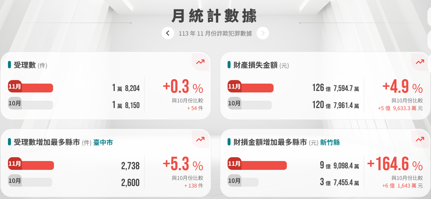 報道援引台內務部門統計數據稱,今年9月至11月,台警方受理的詐騙案件每個月都超過18000件;從12月1日至15日,平均每天受理600件。島內民眾財損逐月增加,9月至11月分別達119億、120.8億、126.8億元。