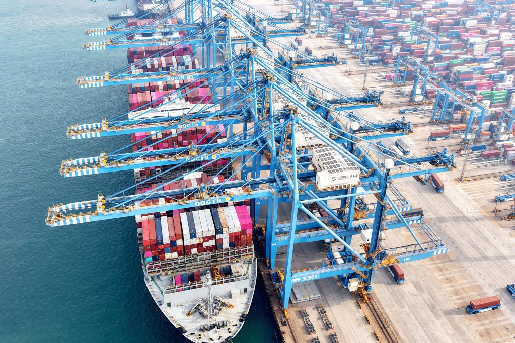 2024年2月10日,在山東港口青島港全自動化碼頭,貨輪在裝卸外貿集裝箱。新華社發(俞方平攝)