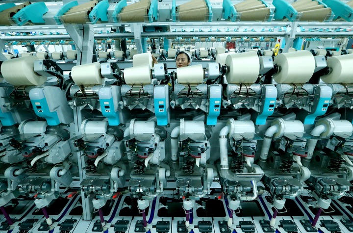 2024年11月27日,在位於青島市即墨區龍山街道的青島即發紡織科技有限公司智慧紡紗生產線上,工人在生產高端纖維。新華社發(梁孝鵬攝)
