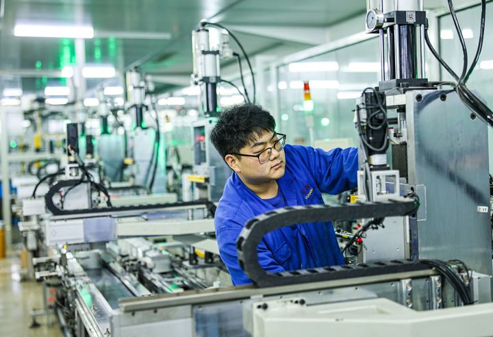 2024年12月12日,在山東省榮成市一家燃氣計量儀表製造企業的智能化生產車間內,維修工人在進行設備調試。新華社發(李信君攝)