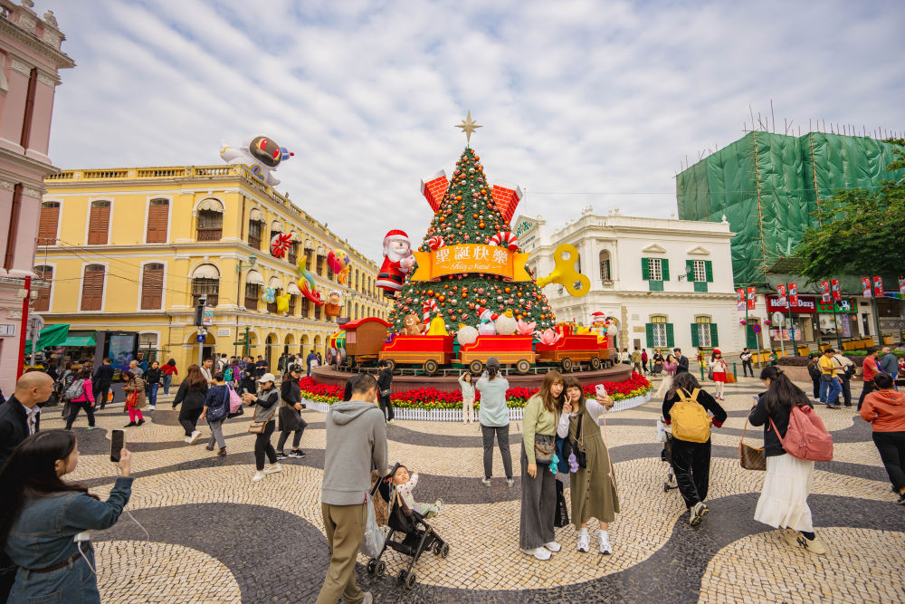 12月12日,遊客在澳門議事亭前地的聖誕樹前拍照。新華社記者 朱煒 攝