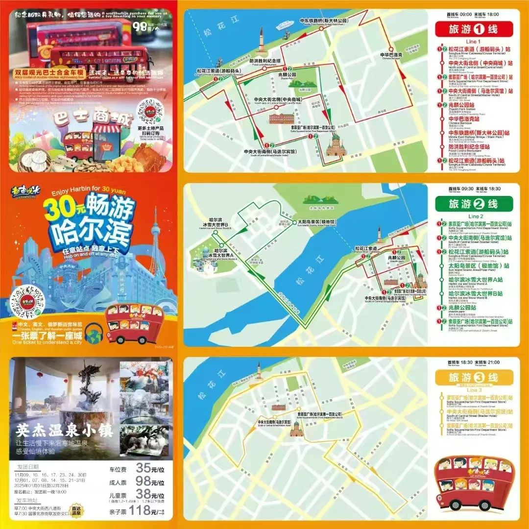 *旅遊1號線:*首車時間為9時,末車時間為18時。途經站點:松花江索道站、中央大街北側站、索菲亞廣場站、兆麟公園站、中華巴洛克站、斯大林公園站、防洪紀念塔站、松花江索道站。