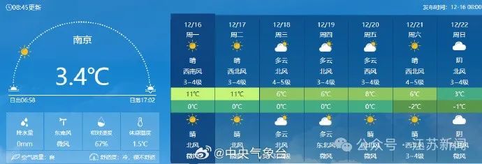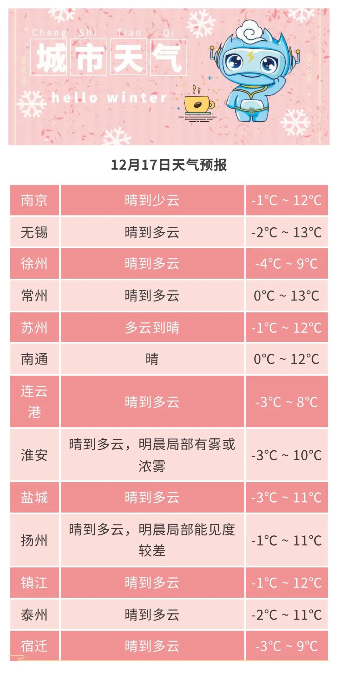*12月17日20時至12月18日20時,*全省晴轉多雲。最高温度:淮北地區4~5℃,其他地區6~7℃;最低温度:江蘇西北部地區-3~-4℃,部分地區有冰凍,本省東部地區0℃左右,其他地區-1~-2℃。全省偏北風,風力:江蘇東部地區4級左右逐漸增強至5級陣風6-7級,其他地區3-4級逐漸增強至4-5級。