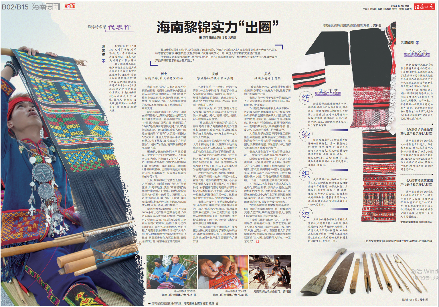 編者按: 北京時間12月5日23:13,對於海南、對於黎族,是一個值得載入歷史的時刻。消息從南美洲國家巴拉圭傳來——聯合國教科文組織保護非物質文化遺產政府間委員會第19屆常會通過評審,決定將“黎族傳統紡染織繡技藝”從《急需保護的非物質文化遺產名錄》轉入《人類非物質文化遺產代表作名錄》。本期《海南週刊》封面從代表作、畫像、提燈人、新潮範、百變紋、粉絲圈6個方面推出全“錦”式報道,敬請關注!