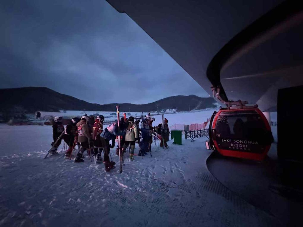 12月2日,在吉林萬科松花湖滑雪度假區,中日兩國滑雪少年一同等待乘坐纜車。受訪者供圖