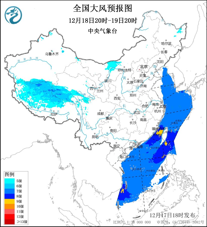 12月18日20時至19日20時,西藏北部、青海南部、川西高原北部、內蒙古中部等地部分地區有5~7級、陣風8~10級的大風;黃海大部海域、東海大部海域、台灣海峽、台灣以東洋麪、巴士海峽、南海大部海域將有7~8級、陣風9~10級的北到東北風,其中台灣海峽、台灣東南洋麪和南海西南部部分海域的風力可達9級、陣風10~11級。