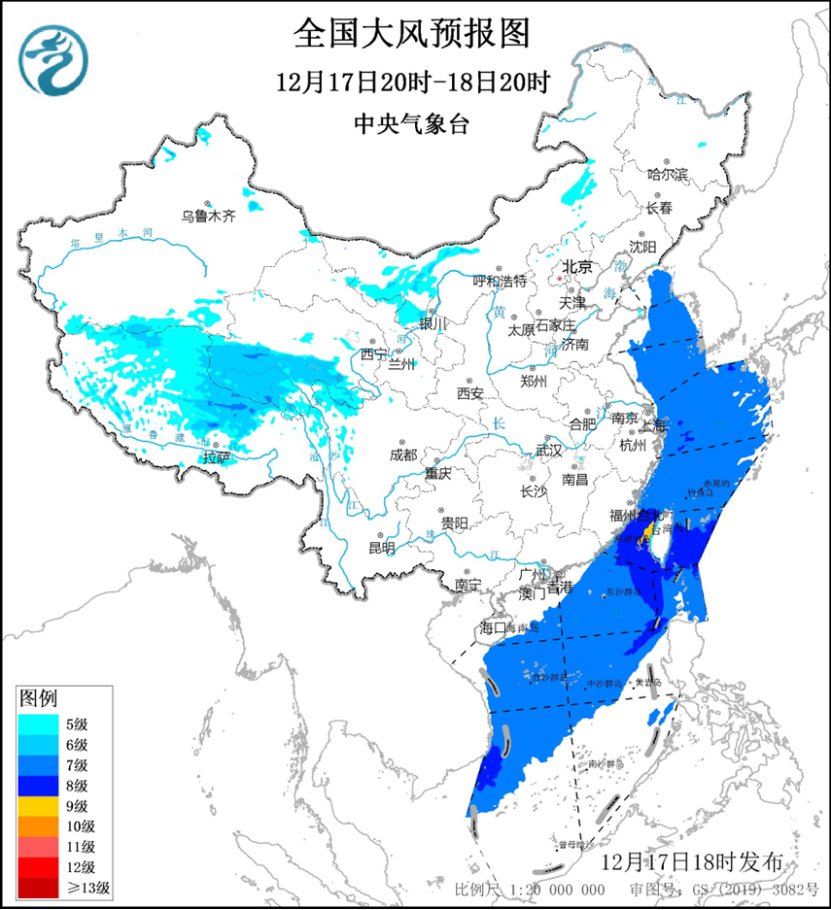 17日夜間至18日,受冷空氣影響,中東部地區氣温下降2~4℃。預計,17日20時至18日20時,西藏北部、青海南部、川西高原北部、內蒙古西部等地部分地區有5~7級、陣風8~10級的大風;黃海大部海域、東海大部海域、台灣海峽、台灣以東洋麪、巴士海峽、南海大部海域將有7~8級、陣風9~10級的北到東北風,其中台灣海峽東部海域的風力可達9級、陣風10~11級(見圖1)。18日20時至19日20時,西藏北部、青海南部、川西高原北部、內蒙古中部等地部分地區有5~7級、陣風8~10級的大風;黃海大部海域、東海大部海域、台灣海峽、台灣以東洋麪、巴士海峽、南海大部海域將有7~8級、陣風9~10級的北到東北風,其中台灣海峽、台灣東南洋麪和南海西南部部分海域的風力可達9級、陣風10~11級。中央氣象台12月17日18時繼續發佈大風藍色預警。