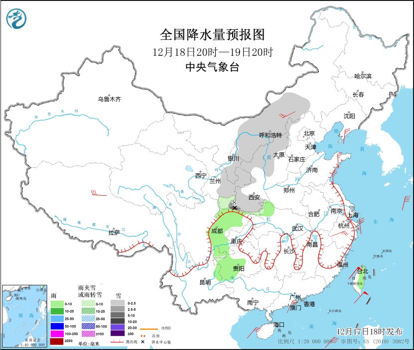 *12月18日20時至19日20時,*內蒙古中部、甘肅東部、寧夏、陝西北部和南部、山西西北部、河北西北部等地部分地區有小雪或雨夾雪,其中,陝西南部、四川盆地西北部等地局地有中到大雪(5~8毫米)。湖北西北部、四川盆地、貴州中西部、雲南東北部、台灣島東部等地部分地區有小雨。內蒙古中部、遼東半島、西藏西北部、山東半島、浙江中北部等地部分地區有4~6級風(見圖3)。
