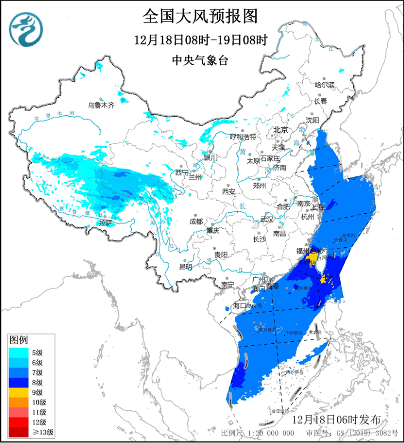18日,受冷空氣影響,長江中下游及其以南地區氣温下降2~4℃。預計,18日08時至19日08時,西藏北部、青海南部、川西高原北部、內蒙古西部等地部分地區有5~7級、陣風8~10級的大風;黃海大部海域、東海大部海域、台灣海峽、台灣以東洋麪、巴士海峽、南海大部海域將有7~8級、陣風9~10級的北到東北風,其中台灣海峽、台灣東南洋麪的風力可達9級、陣風10~11級(見圖1)。中央氣象台12月18日06時繼續發佈大風藍色預警。