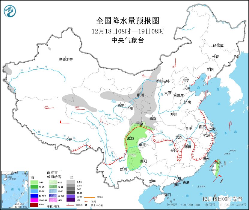 *12月18日08時至19日08時,*內蒙古西部、新疆南疆山區、青海北部和西部、甘肅河西和東部、寧夏、陝西西部和南部、山東半島等地部分地區有小雪或雨夾雪,其中,甘肅東南部、陝西西南部等地部分地區有中到大雪(5~7毫米)。四川盆地、貴州西部、雲南東北部及台灣島中東部等地部分地區有小雨,局地有中雨。內蒙古中西部、西藏北部、青海南部、川西高原北部等地部分地區有4~6級風,其中,西藏北部等地部分地區有7~8級風(見圖2)。