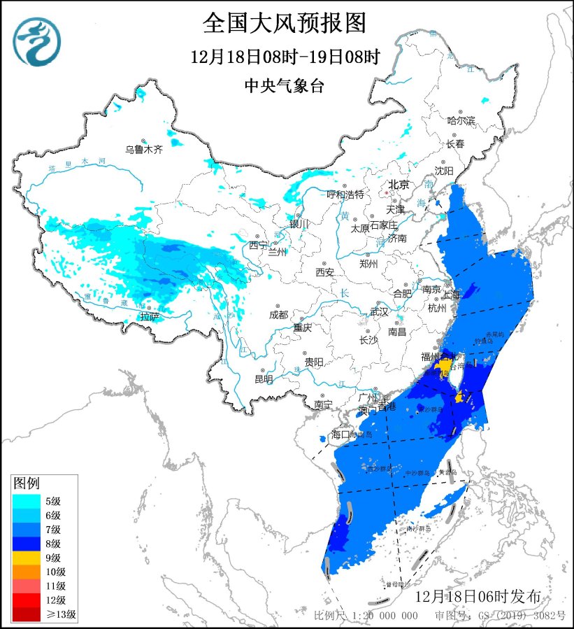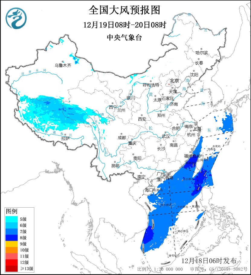 12月19日08時至20日08時,西藏北部、青海南部、川西高原北部、內蒙古中部等地部分地區有5~7級、陣風8~10級的大風;東海東北部和西南部海域、台灣海峽、台灣以東洋麪、巴士海峽、南海大部海域將有7~8級、陣風9~10級的北到東北風。
