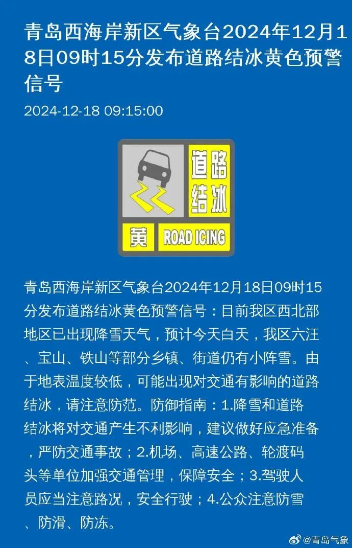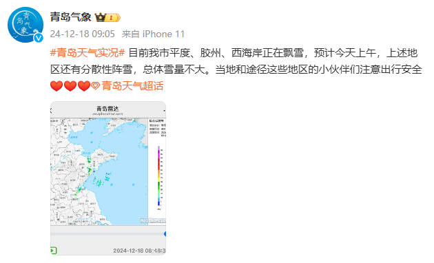 據@青島氣象 發佈的天氣實況,目前我市平度、膠州、西海岸新區正在飄雪,預計今天上午,上述地區還有分散性陣雪,總體雪量不大。當地和途經這些地區的小夥伴們注意出行安全。