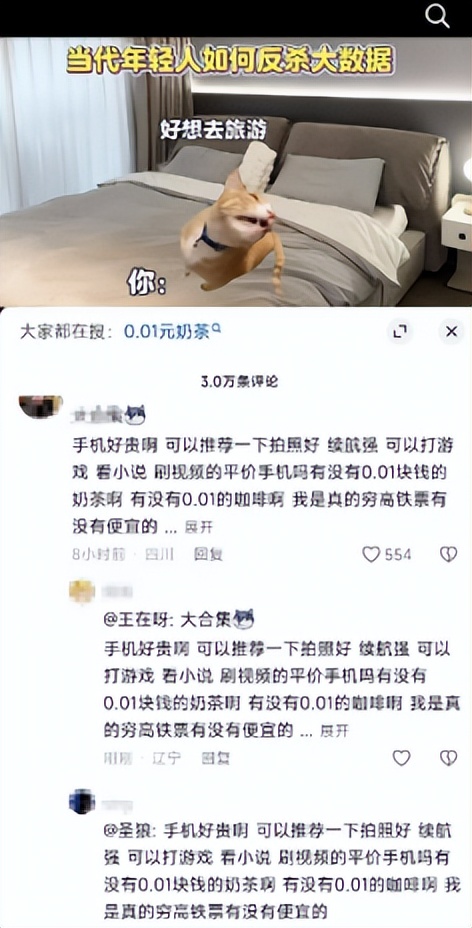 有網友分享了自己的親身經歷:“第一次搜機票直飛最便宜的也要4309元,我就反覆評論‘機票太貴了買不起,不去了’,後來就變成了1903元。”這一經歷引發了眾多網友的共鳴,許多人表示自己也遇到過類似的情況。有的消費者在微信和朋友聊天時提到想買什麼物品,隨後在其他平台便會精準看到相關物品的廣告;有的消費者發現,使用不同的手機登錄網購APP,同一商品的價格居然會相差幾十到上百元。