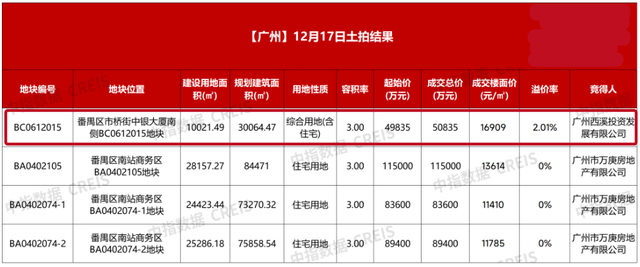 12月17日,廣州成功出讓番禺區四宗宅地,總出讓面積為20.84萬平方米,累計成交金額達33.88億元。其中,綠城集團以總價5.08億元競得番禺區市橋街中銀大廈南側BC0612015地塊,樓面價高達16908元/平方米。值得注意的是,該地塊此前由商務用地兼容商業用地調整為二類居住用地,且按照出讓公告,未來該項目住宅產品最高實用率可達到125%。