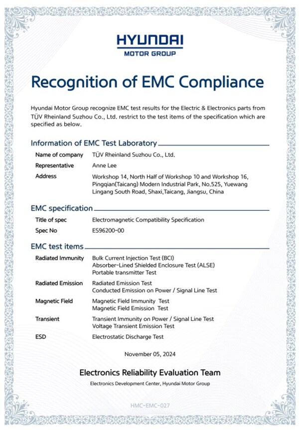 蘇州2024年12月18日 /美通社/ -- 近日,國際獨立第三方檢測、檢驗和認證機構德國萊茵TÜV大中華區(以下簡稱"TÜV萊茵")位於蘇州太倉長三角運營中心的汽車電子電磁兼容(EMC)實驗室同時獲得德國大眾汽車科技有限公司 (以下簡稱"德國大眾")和韓國現代汽車有限公司(以下簡稱"現代汽車")的認可,正式成為其授權第三方實驗室。這意味着TÜV萊茵的實驗室設備、人員配備、技術能力等方面再次得到主流車企的肯定。