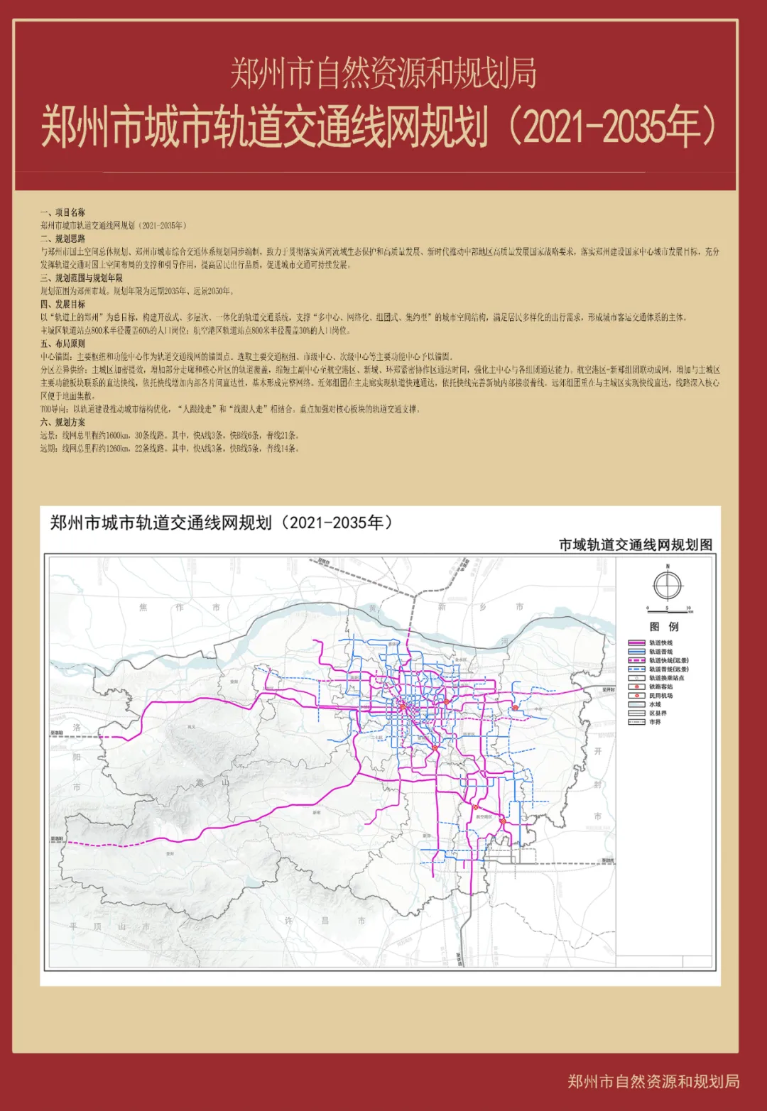 12月18日,鄭州市自然資源和規劃局公示《鄭州市城市軌道交通線網規劃(2021—2035年)》,為鄭州地鐵線路走向提供了具有支撐和引導作用的發展規劃,規劃範圍為鄭州市域,規劃年限為遠期2035年、遠景2050年。
