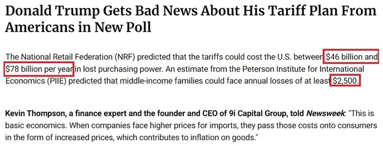 彼得森國際經濟研究所(PIIE)也預測,關税可能會讓每個美國中等收入家庭每年增加至少2500美元的支出。