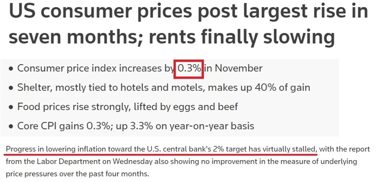 美國勞工部上週發佈的最新通脹數據顯示,11月美國消費價格指數(CPI)同比增長2.7%;而環比則增長0.3%,創下7個月來最大環比漲幅。