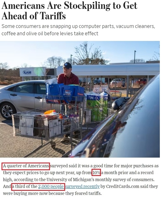 而在美國“信用卡網”對2000人進行的一次調查中,有三分之一的受訪者表示,由於擔心加徵關税可能推高物價,他們現在買得更多了。