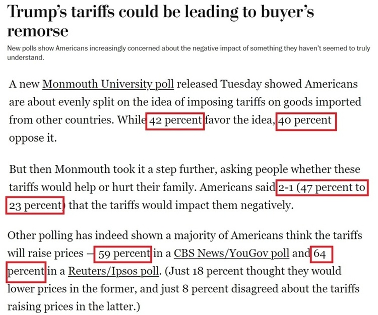 美國哥倫比亞廣播公司與輿觀調查公司共同開展的民調則顯示,59%的美國人認為關税會拉昇本國物價。