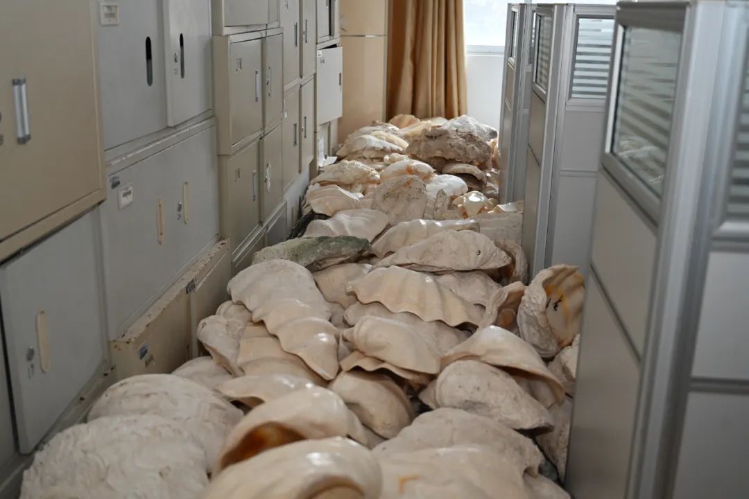 近日,海南省公安廳海岸警察總隊第三支隊成功摧毀一個涉嫌危害珍貴、瀕危野生動物的犯罪團伙,共抓獲涉案人員8人,查扣硨磲擺件629件、一批硨磲原料及製品散件約211.41千克,以及鸚鵡螺、唐冠螺等製品81件。此外,警方還搗毀非法加工窩點1處、經營店面3間,涉案金額估值達150餘萬元。