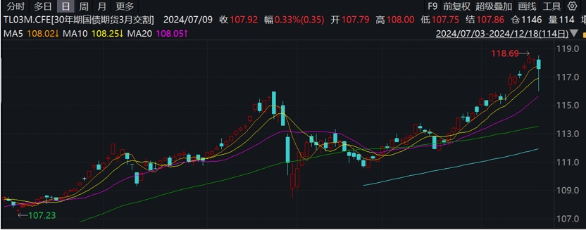 二級市場方面,在央行約談部分金融機構後,12月18日午後開盤,各期國債期貨紛紛下跌。Wind行情顯示,30年期國債期貨主力合約跌幅最大,午後開盤由上漲快速下跌超1.7%,一度創10月以來最大單日跌幅,隨後有所反彈;截至收盤,30年期國債期貨主力合約仍然下跌0.44%。