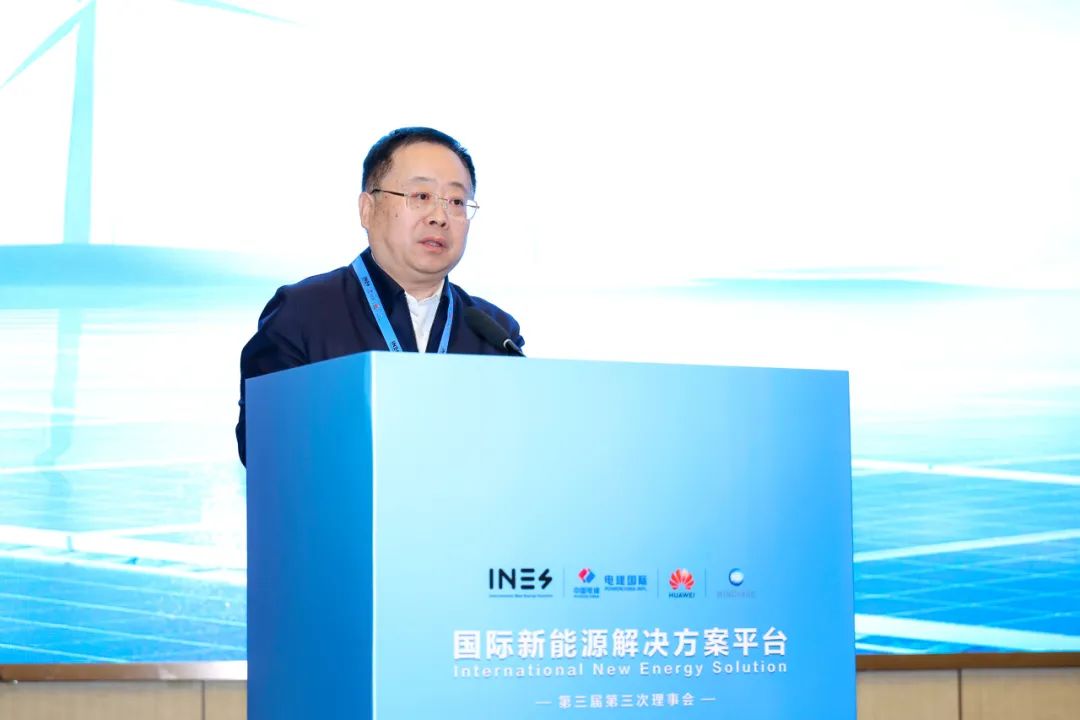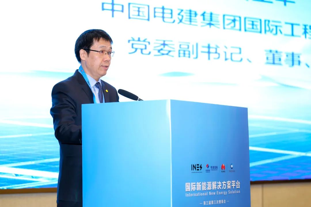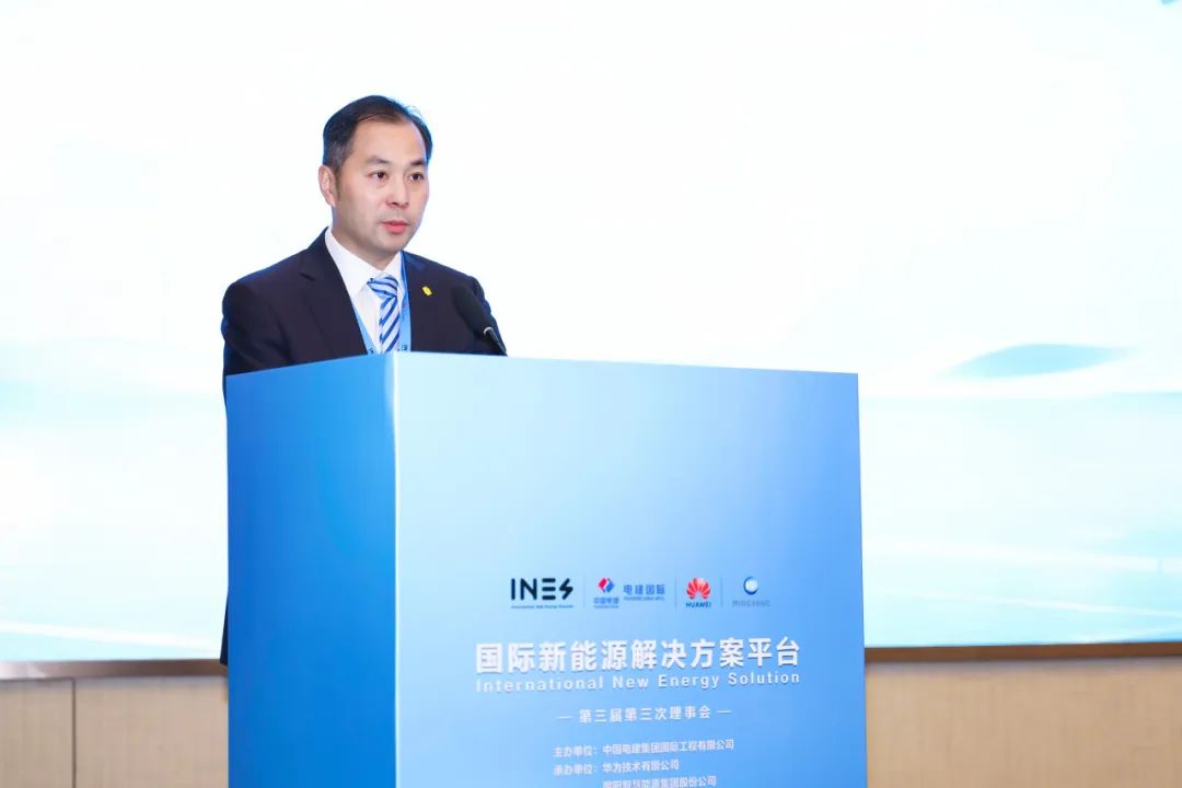 12月12日,國際新能源解決方案平台(以下簡稱INES平台)第三屆第三次理事會在北京召開。會議由中國電建集團國際工程有限公司(以下簡稱電建國際公司)主辦,華為技術有限公司(以下簡稱華為)和明陽智慧能源集團股份公司(以下簡稱明陽智能)承辦,平台33家理事單位100餘名代表參加了此次會議。平台理事長、電建國際公司總經理唐玉華、中國機電產品進出口商會副會長石永紅、華為智能光伏業務總裁孫曉峯、明陽智能副總裁葉凡出席會議並致辭。中國科學院院士、世界科學院院士郭烈錦(視頻出席)、中國電力科學研究院首席專家惠東、上海康恆環境股份有限公司(以下簡稱康恆環境)董事長龍吉生出席會議並作主題報告。電建國際公司副總經理、平台常務副理事長李斯勝主持會議。