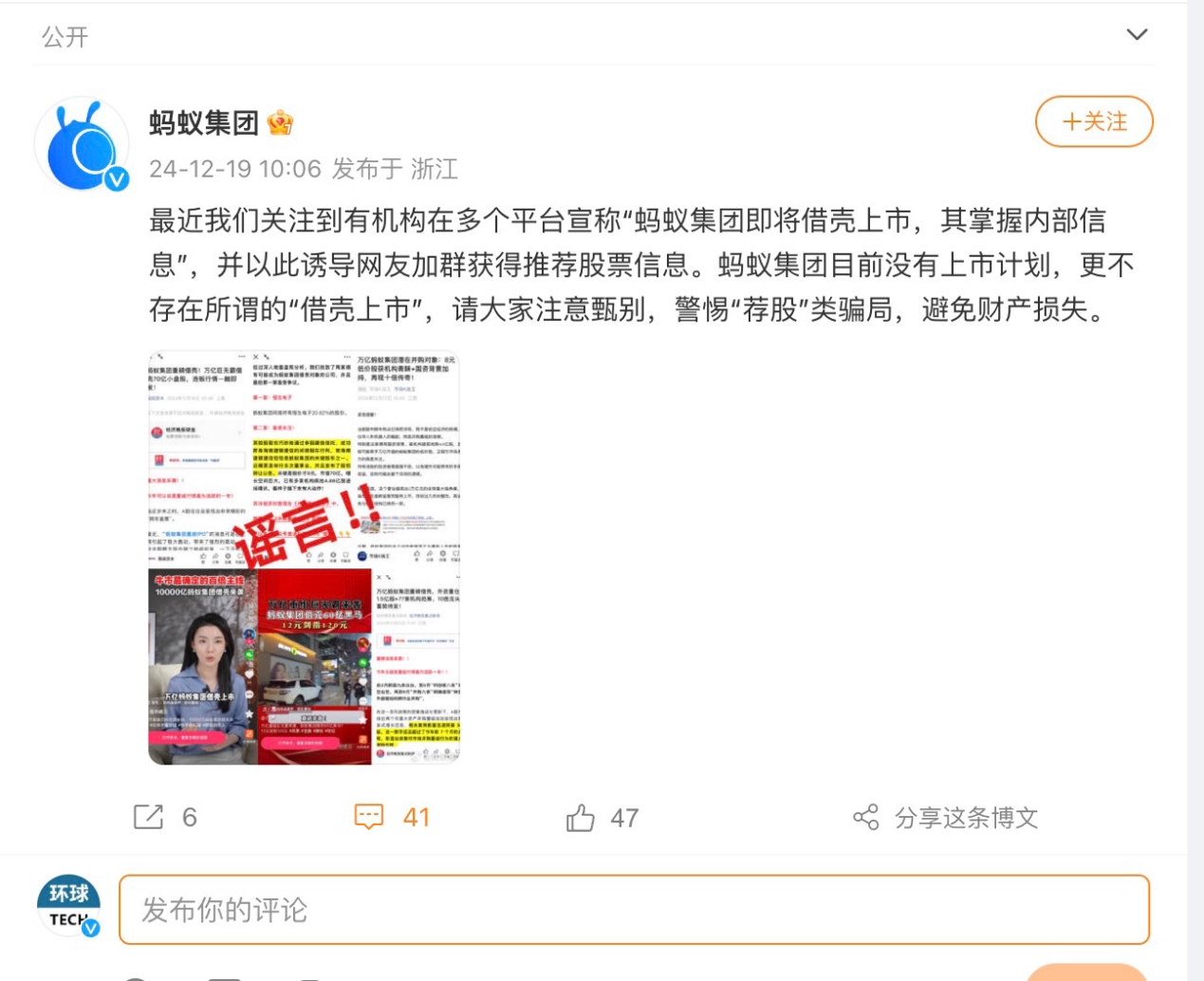【環球網科技報道】12月19日,針對近日有消息稱“螞蟻集團即將借殼上市,其掌握內部信息”,螞蟻集團在官方微博表示,螞蟻集團目前沒有上市計劃,更不存在所謂的“借殼上市”,請大家注意甄別,警惕“薦股”類騙局,避免財產損失。