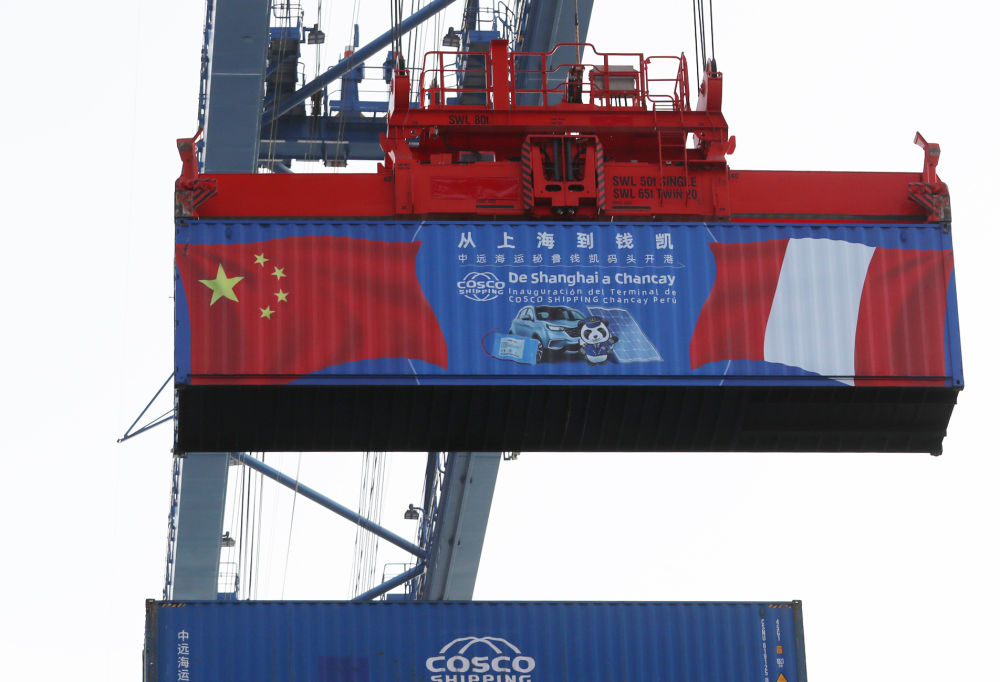 ↑這是11月14日在秘魯錢凱港拍攝的印有“從上海到錢凱”的集裝箱。