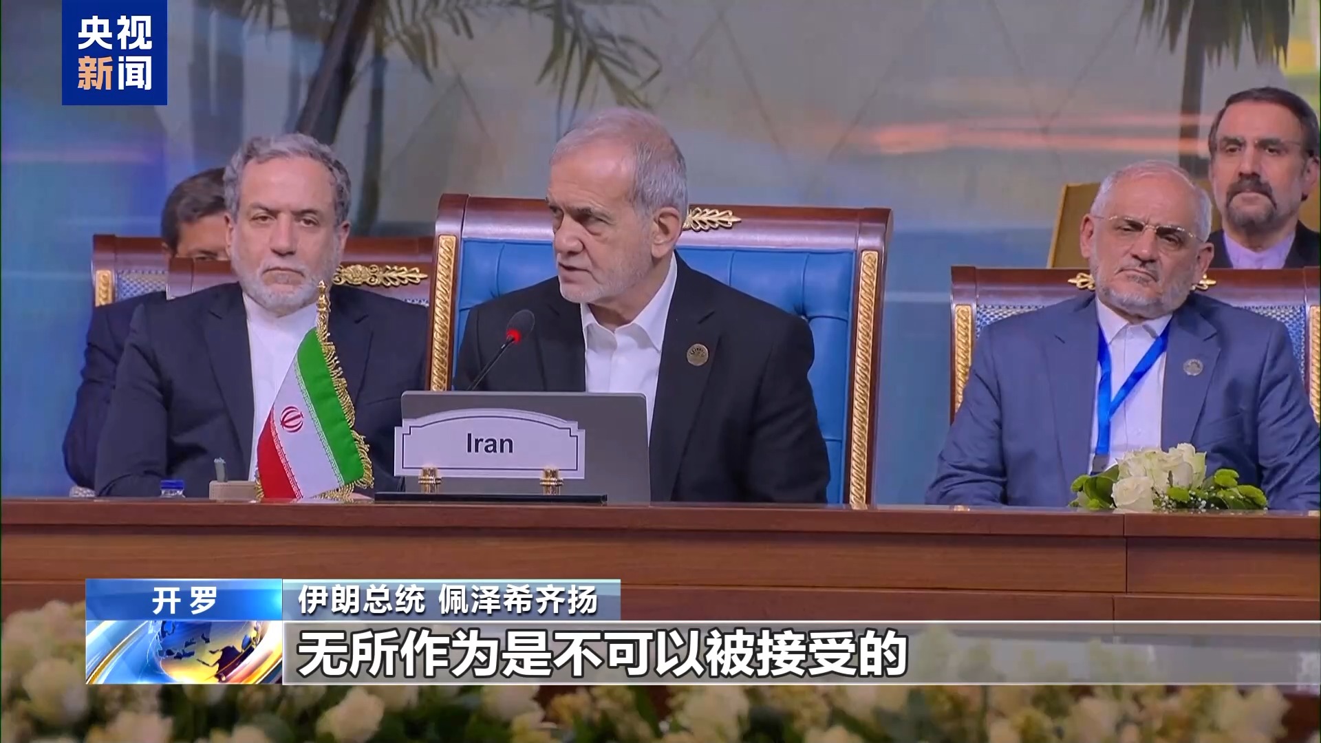 伊朗總統佩澤希齊揚表示,面對以色列的種種罪行,當前首先需要做的就是向以色列施壓,要求其在加沙地帶停火,並停止對黎巴嫩和敍利亞的襲擊。佩澤希齊揚呼籲參加峯會的國家團結起來,採取更為實際、更為直接的行動,防止巴勒斯坦、黎巴嫩與敍利亞民眾受到更多傷害。