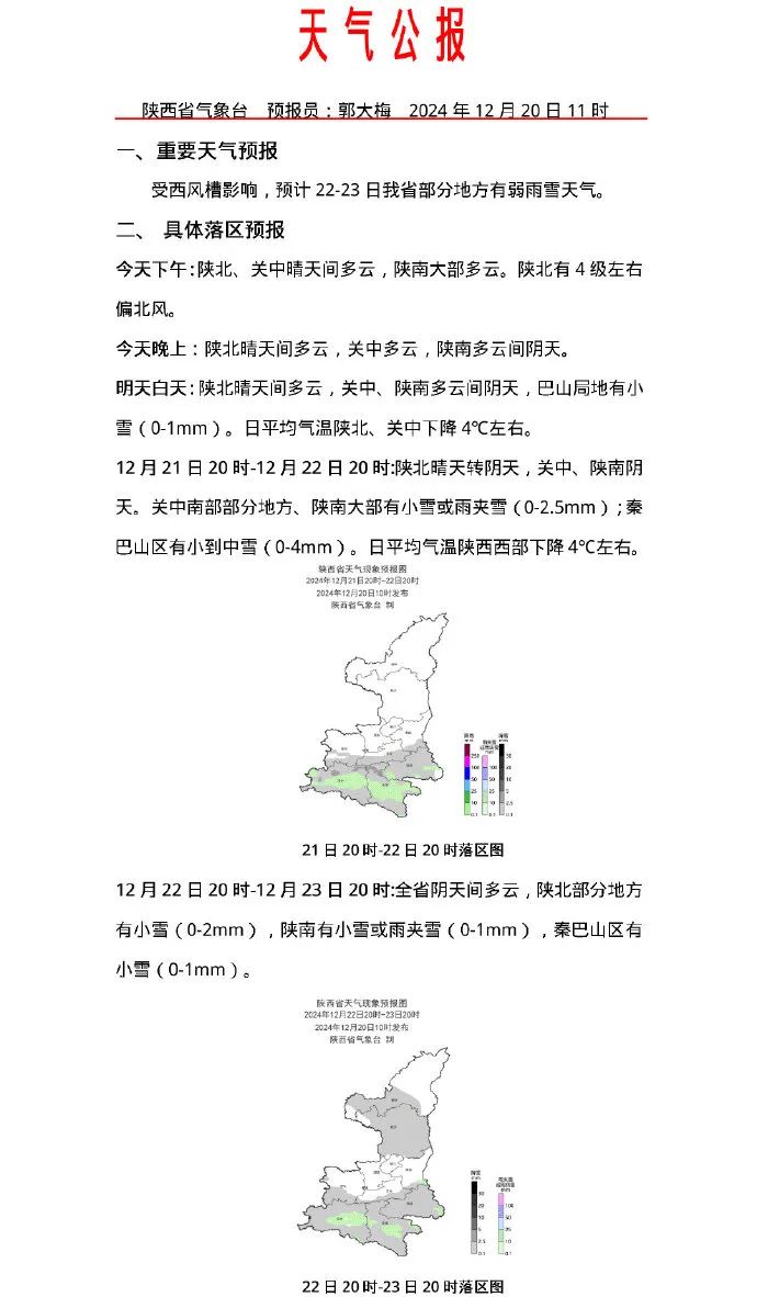 12月20日,陝西氣象發佈最新預報稱,受西風槽影響,預計22-23日我省部分地方有弱雨雪天氣。