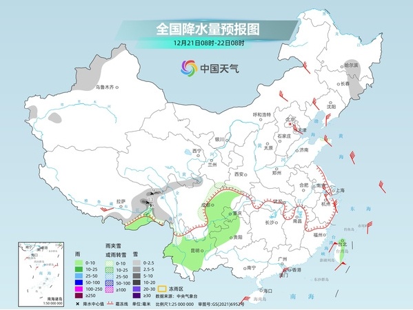 後天,新疆北部、西藏東南部、川西高原北部、雲南西北部、陝西南部、湖北中西部、河南西部和南部等地部分地區有小到中雪或雨夾雪。四川盆地、重慶大部、貴州中北部、雲南西部和中北部、湖南中西部、台灣島東部等地部分地區有小雨。
