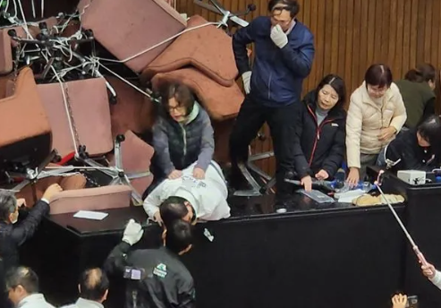 【環球網報道】據今日新聞網、東森新聞雲等台媒12月20日報道,台立法機構今天(20日)預計排審“選罷法”、“憲訴法”及“財劃法”等修正草案,為了不讓國民黨強行三讀通過,民進黨民意代表19日深夜趁藍營不注意破窗進入台立法機構議場,並把門都鎖住,藍白民意代表無法入場。今天9時會議時間一到,國民黨民意代表開始破門,經不斷推擠後,順利進入議場,雙方爆發嚴重推擠衝突,民進黨民意代表賴惠員更與國民黨民意代表葉元之扭打成一團,國民黨民意代表廖先翔則用腳“鎖住”民進黨民意代表脖子。