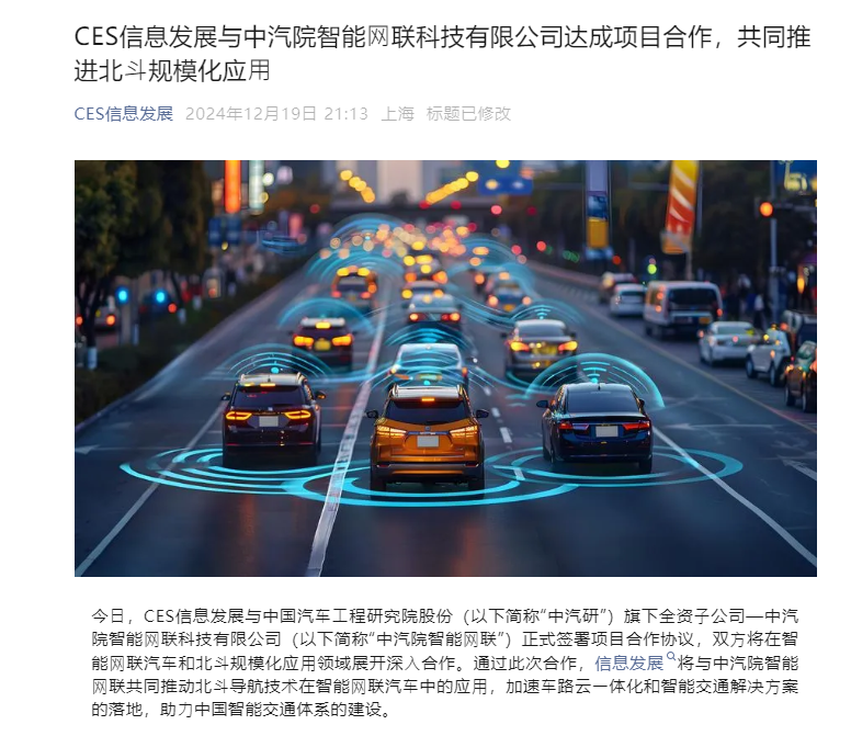 CES信息發展與中汽研達成2億戰略合作 加速北斗智能網聯汽車落地