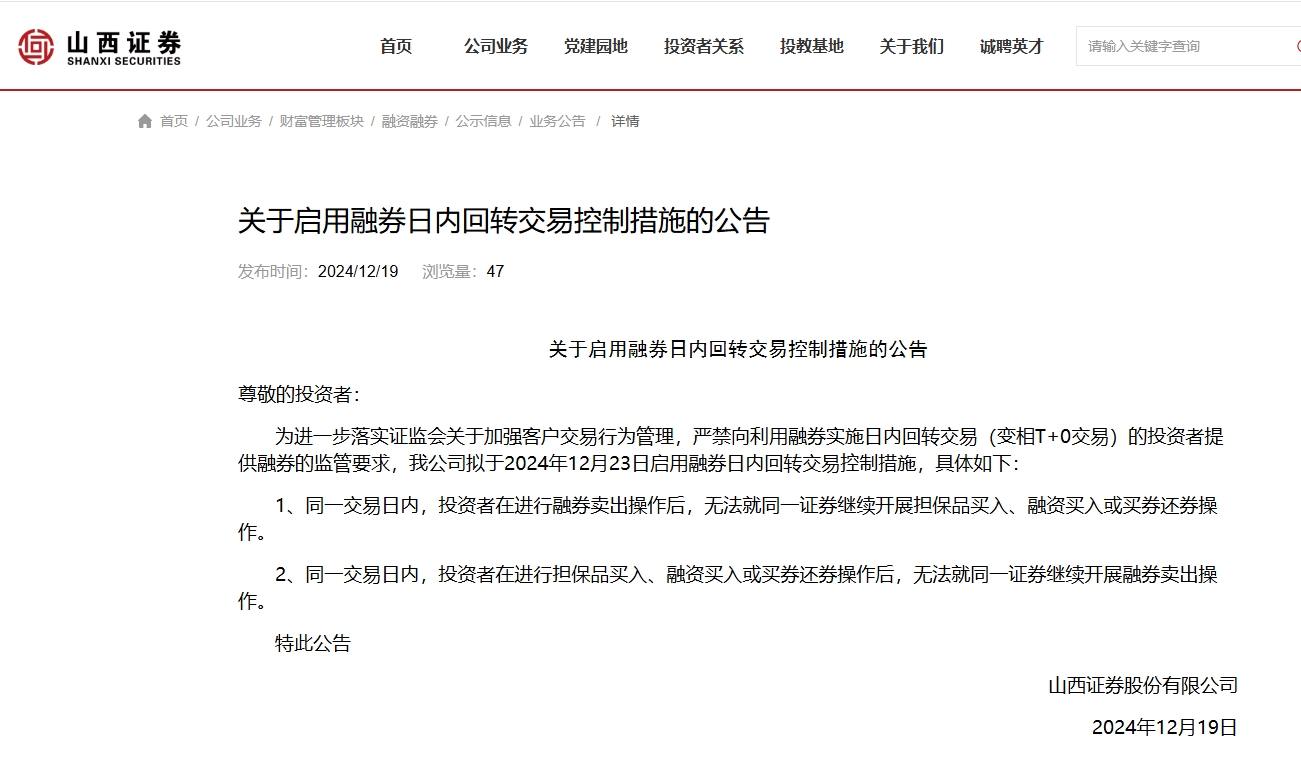 而同一日,山西證券發佈公告,擬於12月23日啓動融券日內迴轉交易控制措施,即同一交易日內,投資者在進行融券賣出操作後,無法就同一證券繼續開展擔保品買入、融資買入或買券還券操作;同一交易日內,投資者在進行擔保品買入、融資買入或買券還券操作後,無法就同一證券繼續開展融券賣出操作。